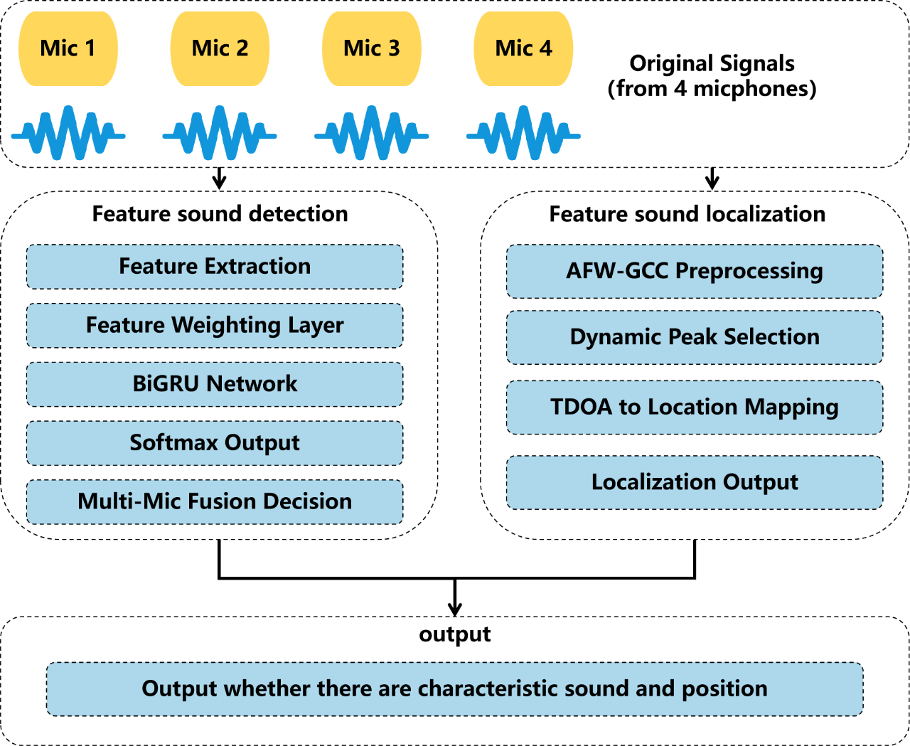 ͼ3 ϵͳËã·¨Á÷³ÌʾÒâͼ¡£¡£¡£¡£¡£¡£BiGRUÄ£×ÓÓÃÓÚÒì³£Éùʶ±ð£¬£¬£¬£¬£¬AFW-GCCË㷨ʵÏָ߾«¶ÈÉùÔ´¶¨Î»¡£¡£¡£¡£¡£¡£